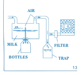 在生產過程中,為了防止食品被二次污染,同時又要達到量產,生產廠家會采用一些自動化設備去完成,其原理為:利用高壓風機的吸力將盛物槽里的空氣吸盡,當槽里的氣壓低于大氣壓時,槽內的流食會通過由槽底接上來的導管被壓入導管另一頭的瓶子(bottles),由于高壓風機在工作時會將少量液體隨著空氣帶走,為了不損壞高壓風機,在高壓風機進風口前端某處會安裝一個過濾器(filter),在過濾器與盛物槽出風管相連處下端還會裝一個存水器(trap),盛裝隨氣流跑出來的液體。